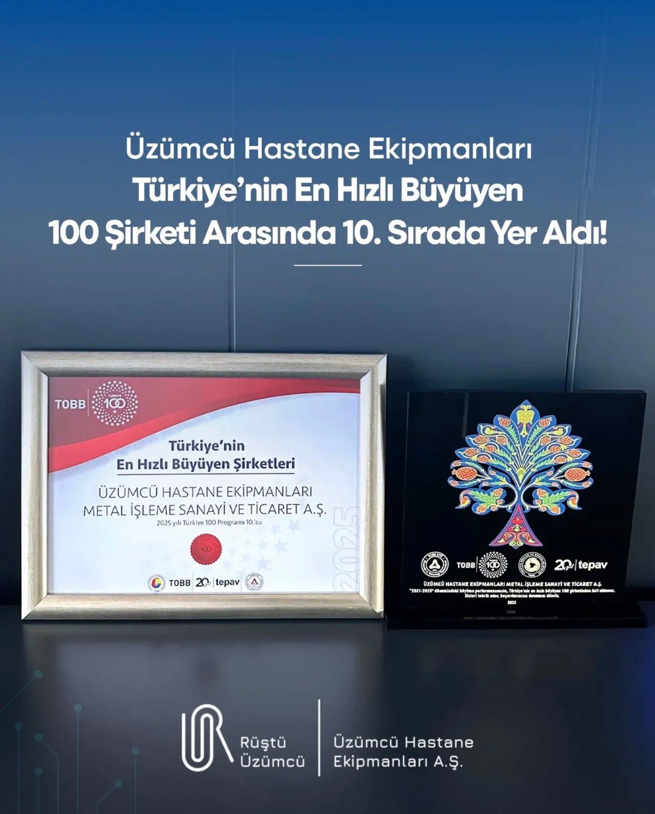 Üzümcü Hastane Ekipmanları Metal İşleme Sanayi ve Ticaret A.Ş., Türkiye Odalar ve Borsalar Birliği (TOBB) tarafından açıklanan Türkiye’nin en hızlı büyüyen 100 şirketi listesinde 10. sırada yer almıştır. Bu başarı, şirketin sağlık sektörü alanındaki güçlü performansını ve sürdürülebilir büyüme stratejilerini yansıtmaktadır.
