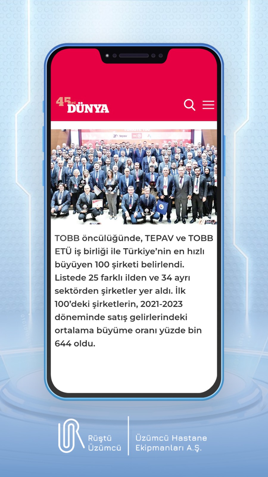 Üzümcü Hastane Ekipmanları Metal İşleme Sanayi ve Ticaret A.Ş., Türkiye Odalar ve Borsalar Birliği (TOBB) tarafından açıklanan Türkiye’nin en hızlı büyüyen 100 şirketi listesinde 10. sırada yer almıştır. Bu başarı, şirketin sağlık sektörü alanındaki güçlü performansını ve sürdürülebilir büyüme stratejilerini yansıtmaktadır.